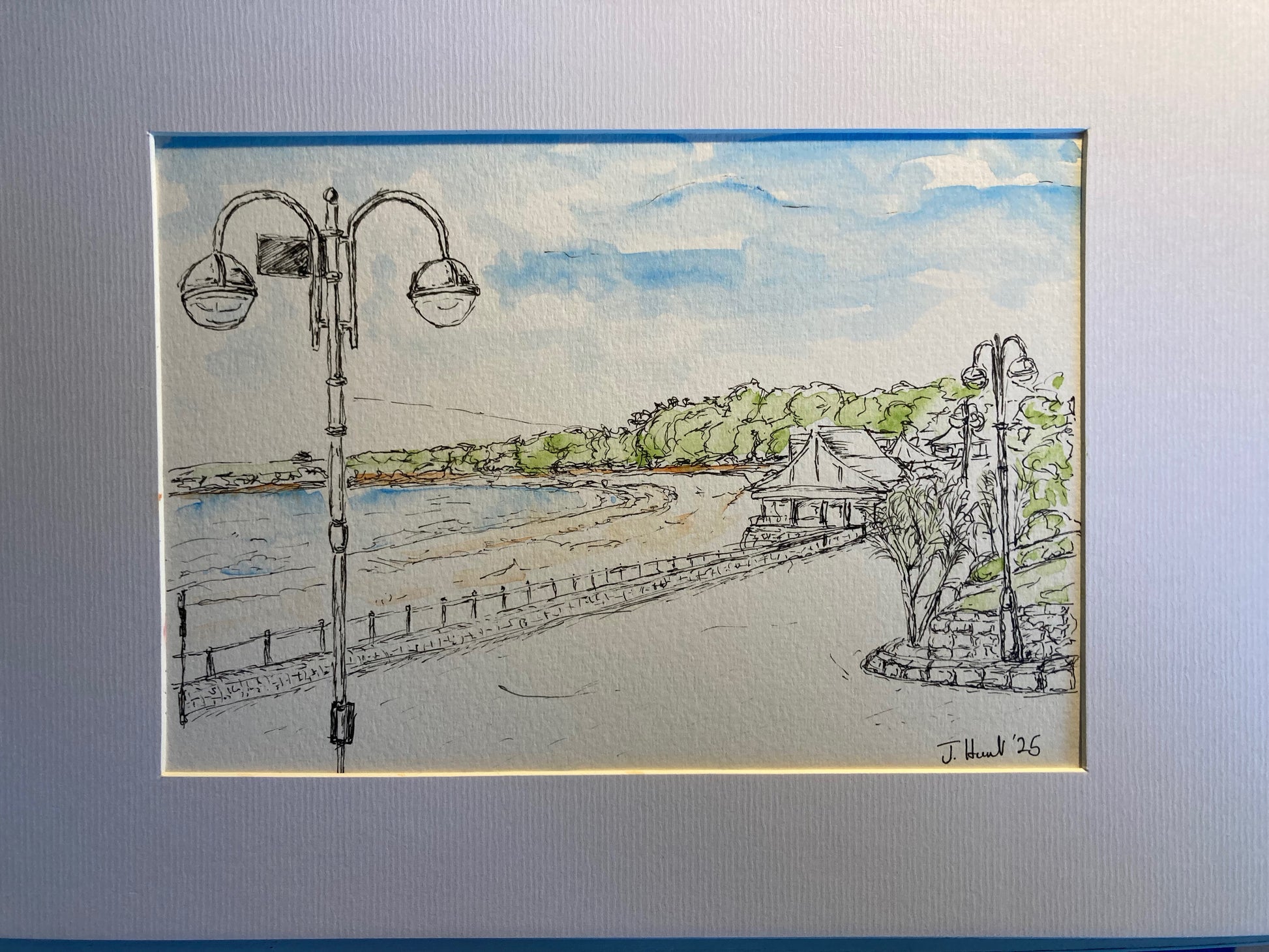 A framed A4 ink and watercolour painting of Barry Island beach and the Bay 5 Cafe.