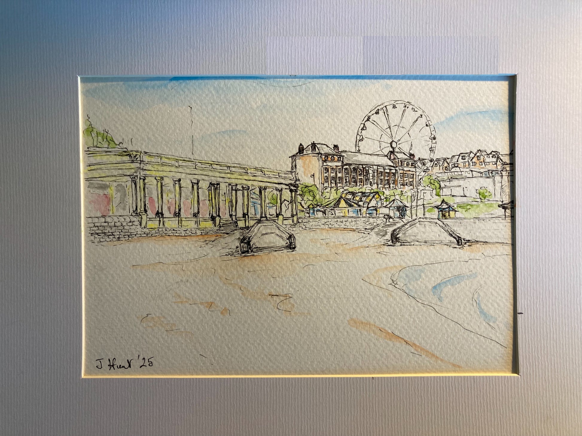 A framed A4 ink and watercolour painting of Barry Island Promenade and Pleasure Beach..
