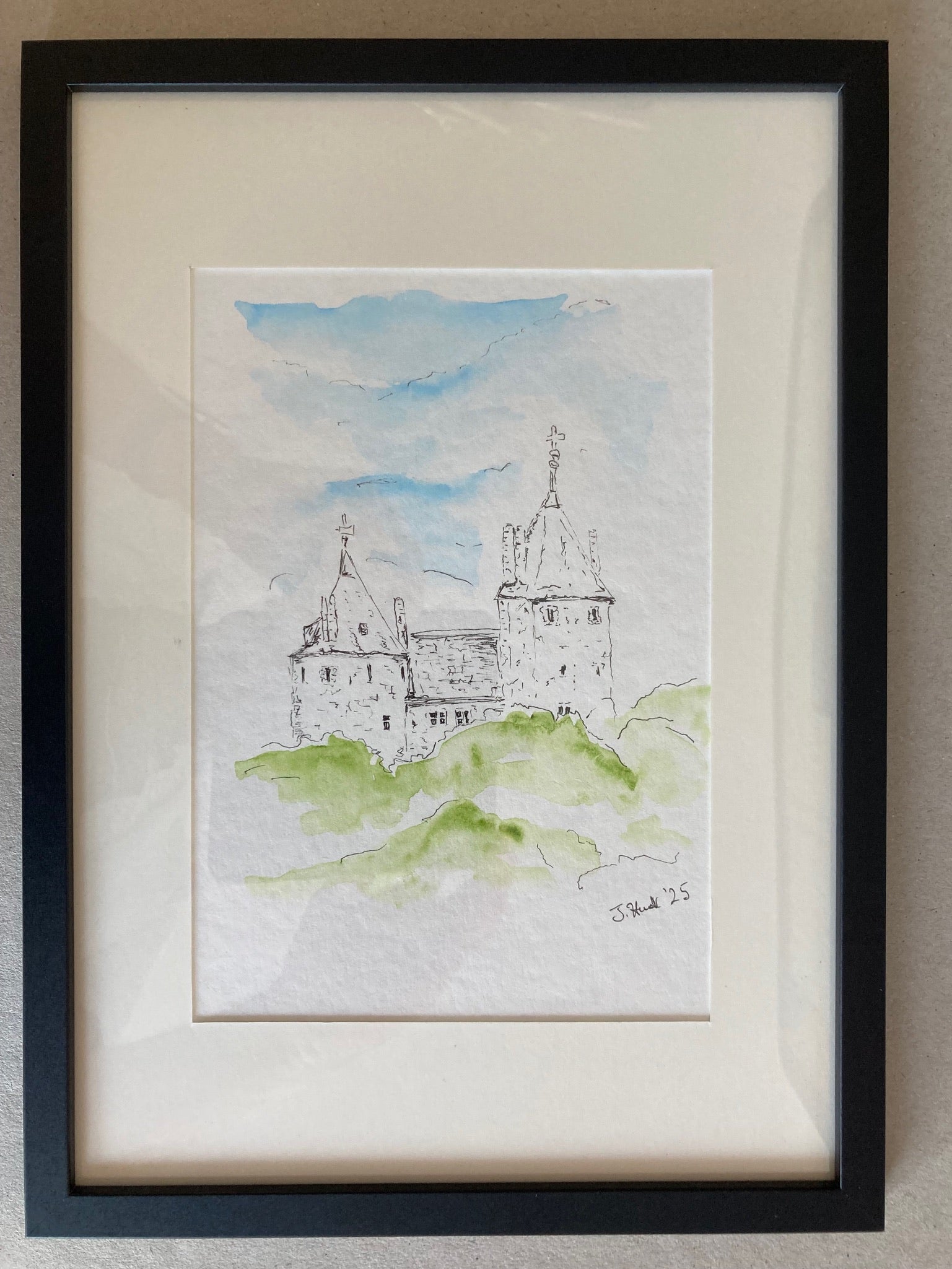 A framed A4 ink and watercolour painting of Castell Coch near Cardiff