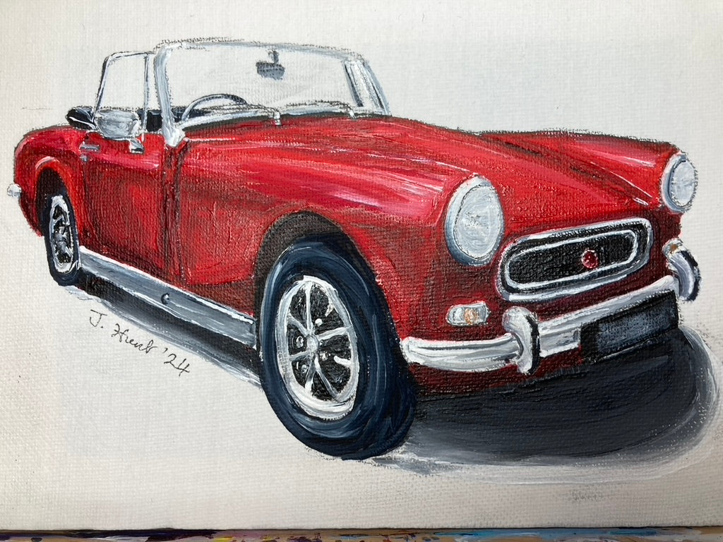An original acrylic painting of a red MG Midget convertible with Chrome bumpers from around 1970 in red. the canvas is 18cm x 13 cm x 1 cm.