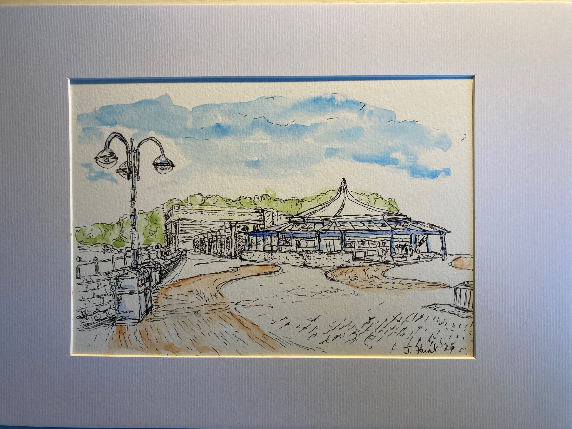 A framed A4 ink and watercolour painting of Marco's Cafe on Barry Island sea front (where Stacey works in Gavin and Stacey).