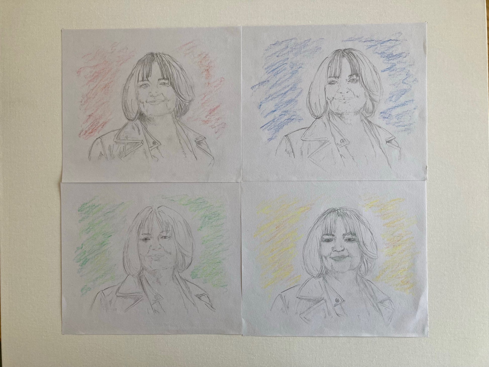 An set of original sketches of Nessa, from Gavin and Stacey, in a framed display.