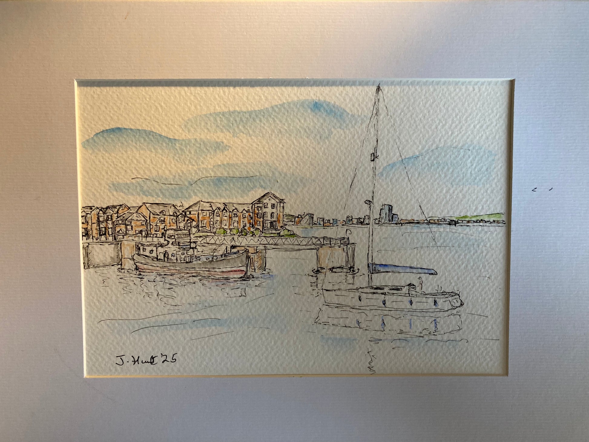 A framed A4 ink and watercolour painting of the entrance to Penarth Marina