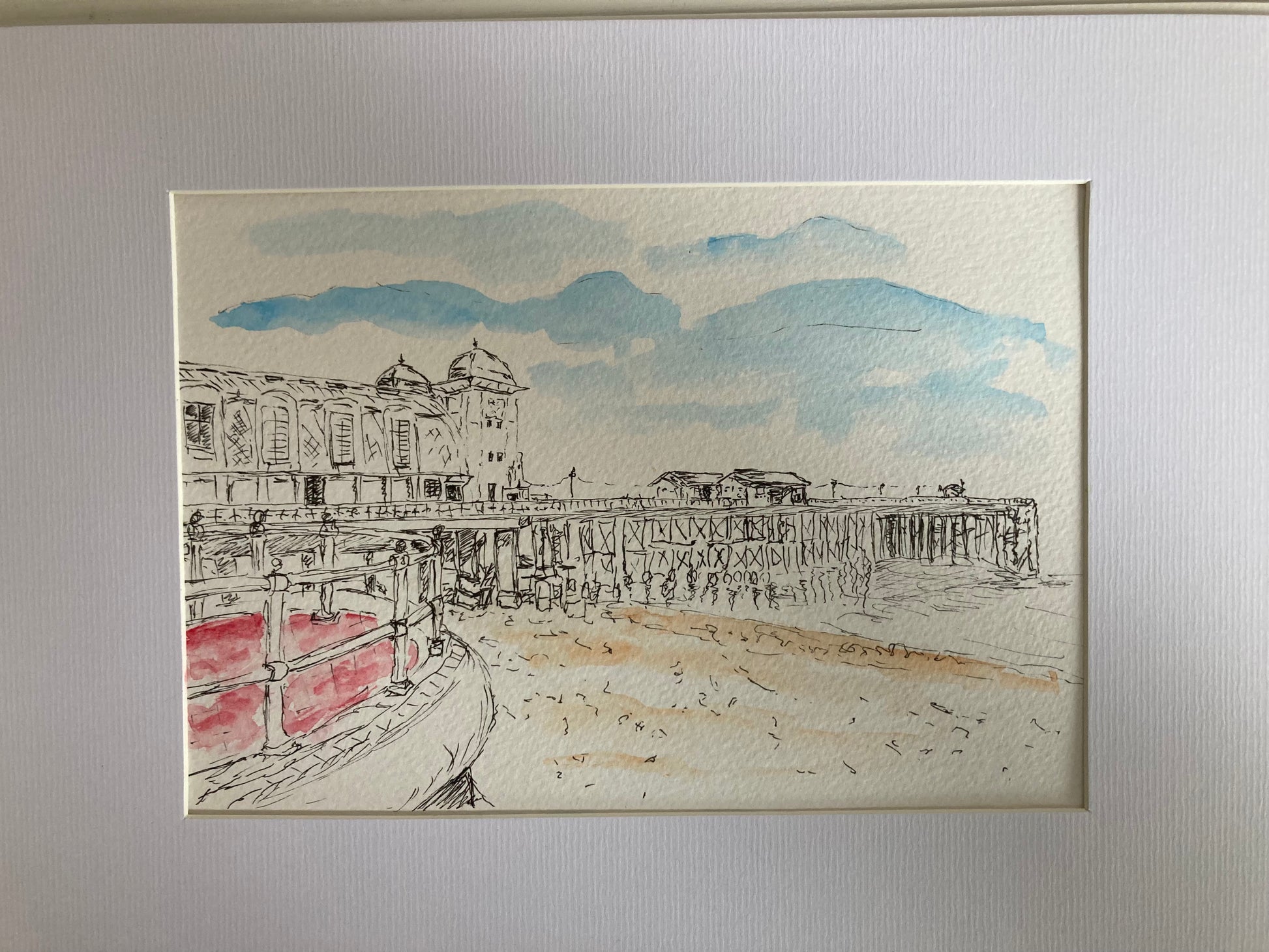 A framed A4 ink and watercolour painting of Penarth Pier near Cardiff