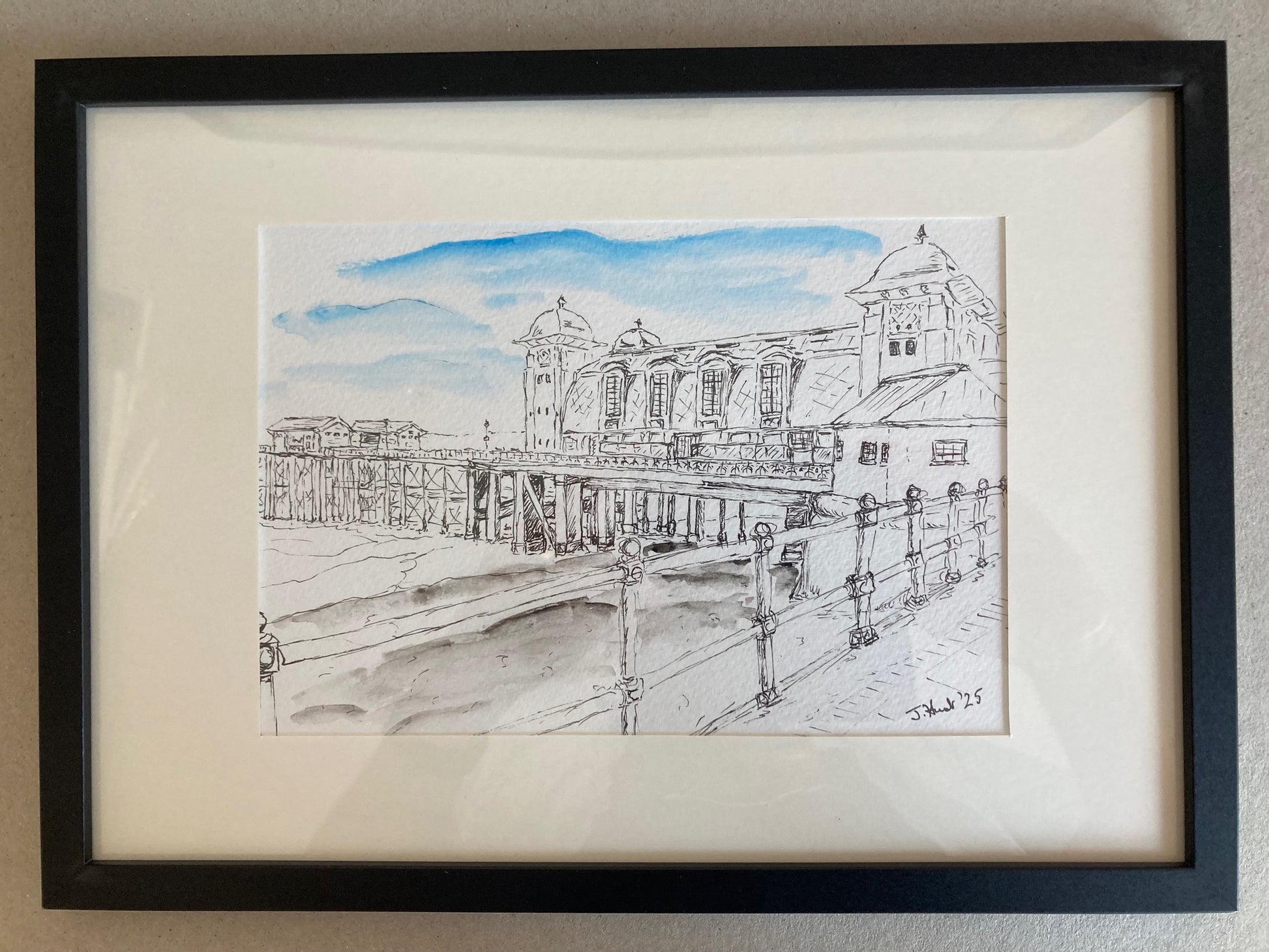 A framed A4 ink and watercolour painting of Penarth Pier near Cardiff