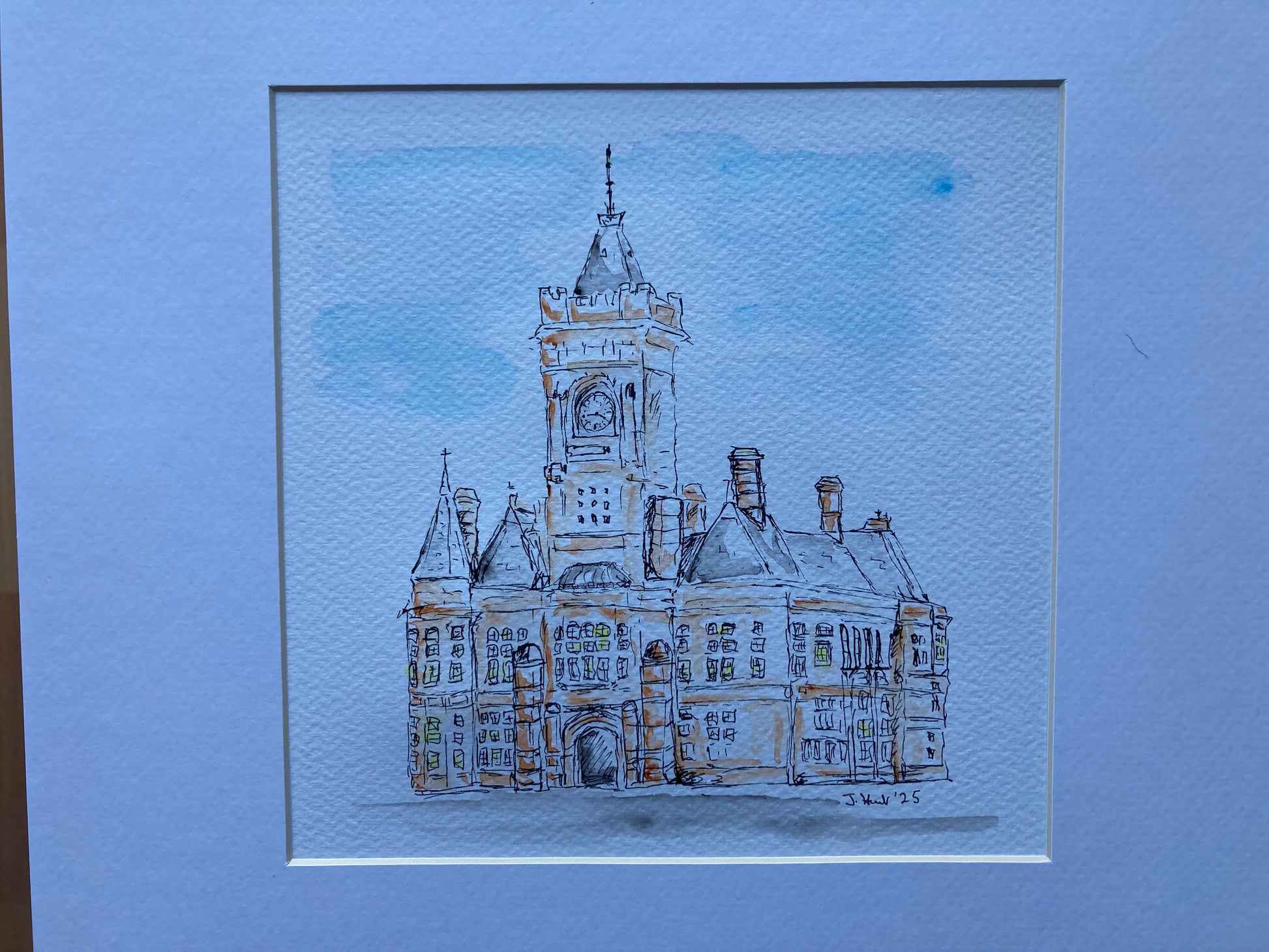 A ink sketch view of the Pierhead Building in Cardiff Bay - on an A3 sheet.