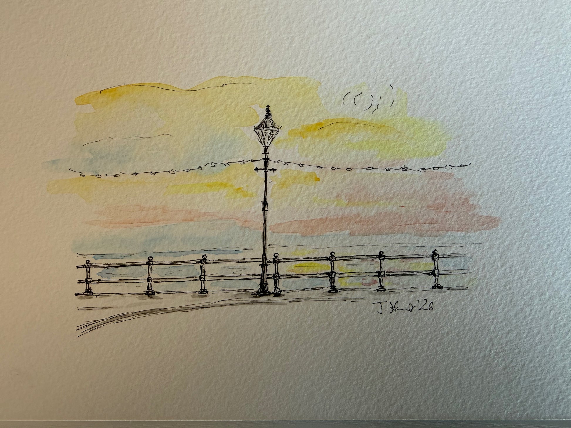 A framed A5 ink and watercolour painting of Penarth Sea Front looking out to the beach - A5 Size.