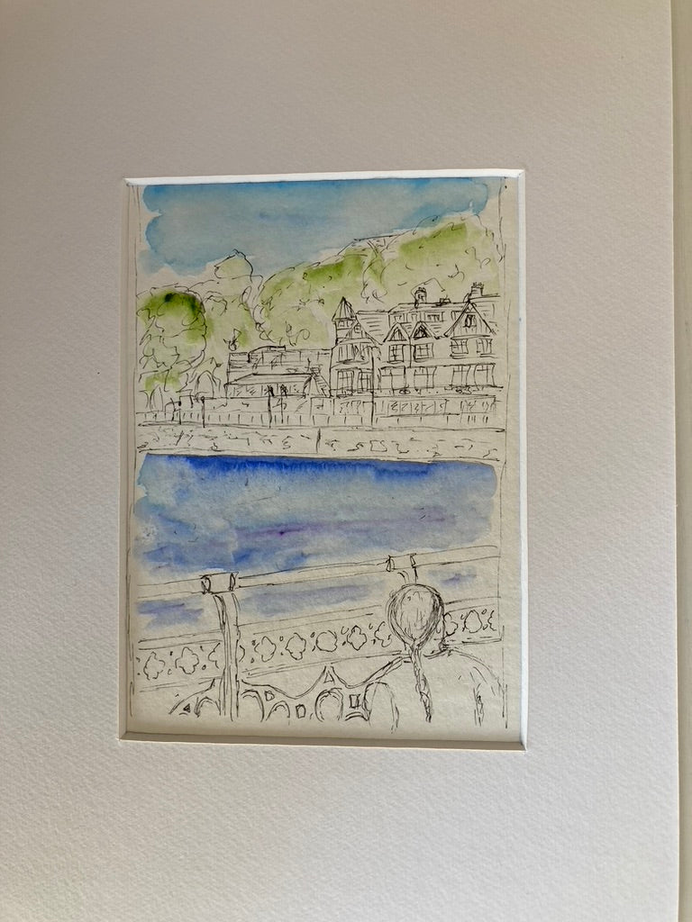 A framed ink sketch and watercolour view of Penarth Sea Front from the pier through the seating area.