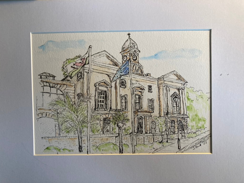 A framed A4 ink and watercolour painting of The Old Custom House Penarth Marina.